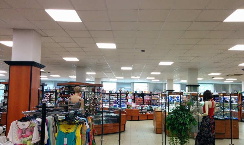 Основное освещение торговых помещений обеспечивают офисные светодиодные светильники L-office 55 производства известной казанской компании Ледел. Они отлично зарекомендовали себя как надежные, эстетичные и экономичные источники света, идеально подходящие для освещения торговых помещений, офисов и многого другого.