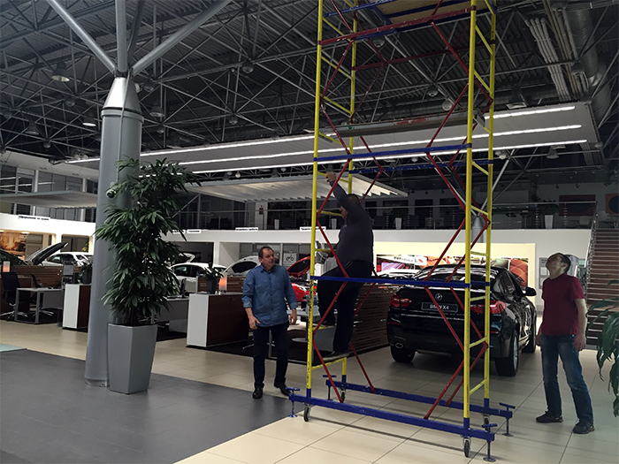 Особенностью этого проекта стало то, что все работы приходилось проводить не в пустом помещении, как обычно, а в действующем салоне, полном дорогостоящих автомобилей и другого оборудования. Высококвалифицированные специалисты нашей компании успешно справились с этой сложной задачей, ювелирно выполнив монтаж.